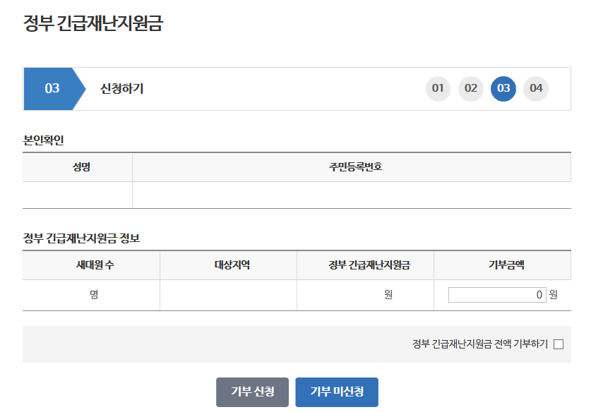 확인 버튼을 누르시면 기부신청 페이지로 넘어갑니다.