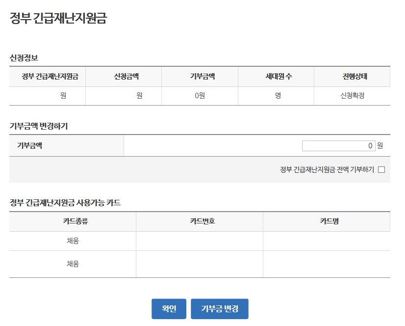 모든 신청을 마치고 나면 최종적으로 신청 내역과 정부 긴급재난지원금으로 사용가능한 카드들이 모두 뜹니다.