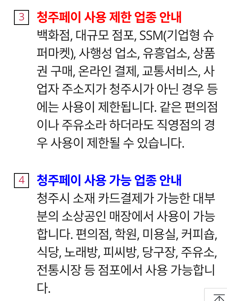 청주시 홈페이지에 명시되어 있기로 청주페이는 백화점, 대규모 점포, SSM(기업형 슈퍼마켓), 사행성 업소, 유흥업소 등에서는 사용이 제한되며, 편의점, 학원, 미용실, 카페, 식당, 노래방, 피씨방, 당구장, 주유소, 전통시장 등 청주시 소재 카드결제가 가능한 대부분의 소상공인 매장에서 사용 가능합니다.