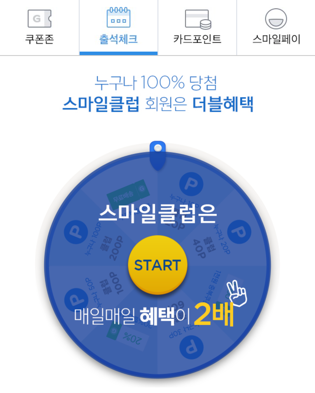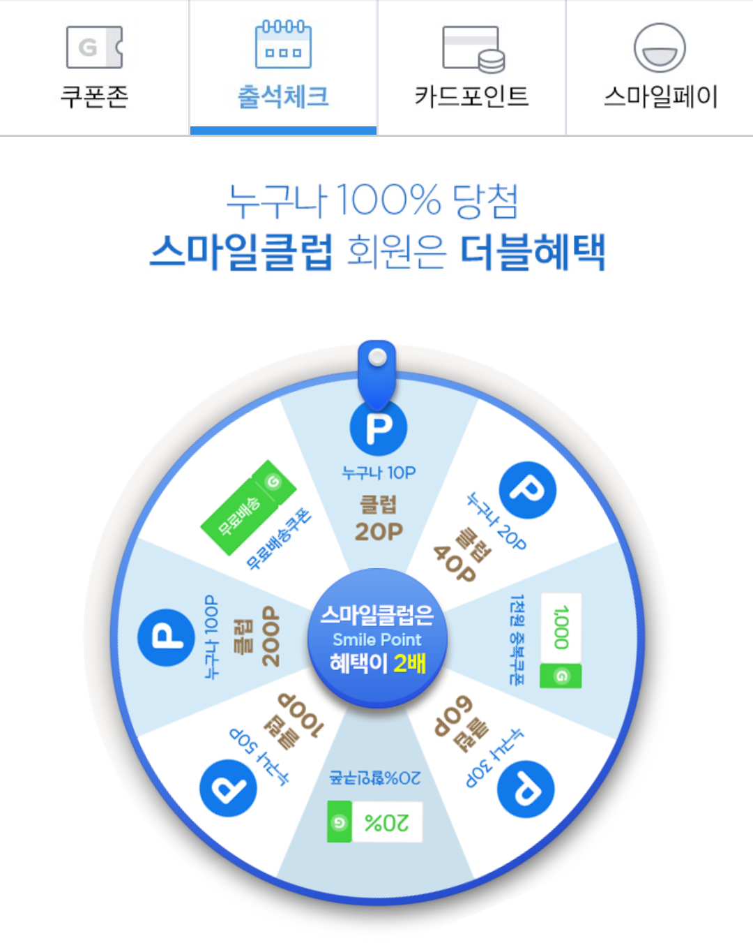 지마켓 메인 화면에서 '쿠폰/출첵 - 출석체크'로 들어가셔서 룰렛을 돌리면 하루에 한 번 최소 10P를 받을 수 있고, 스마일클럽 회원이시면 2배 적립 가능합니다.