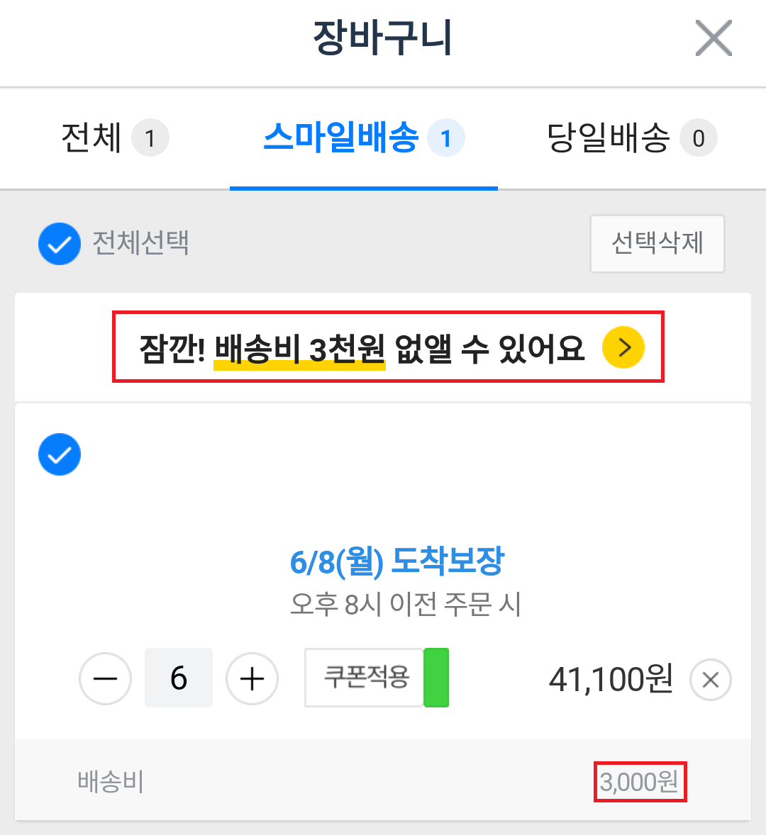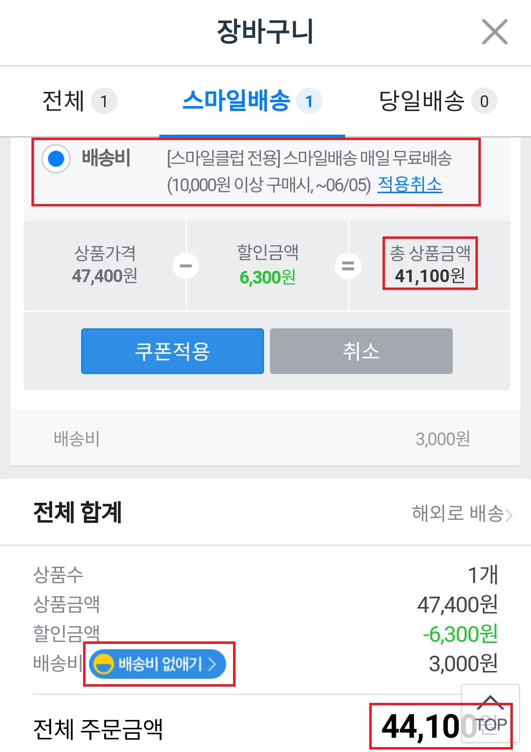 장바구니에서 무료배송 쿠폰을 적용시킵니다.
