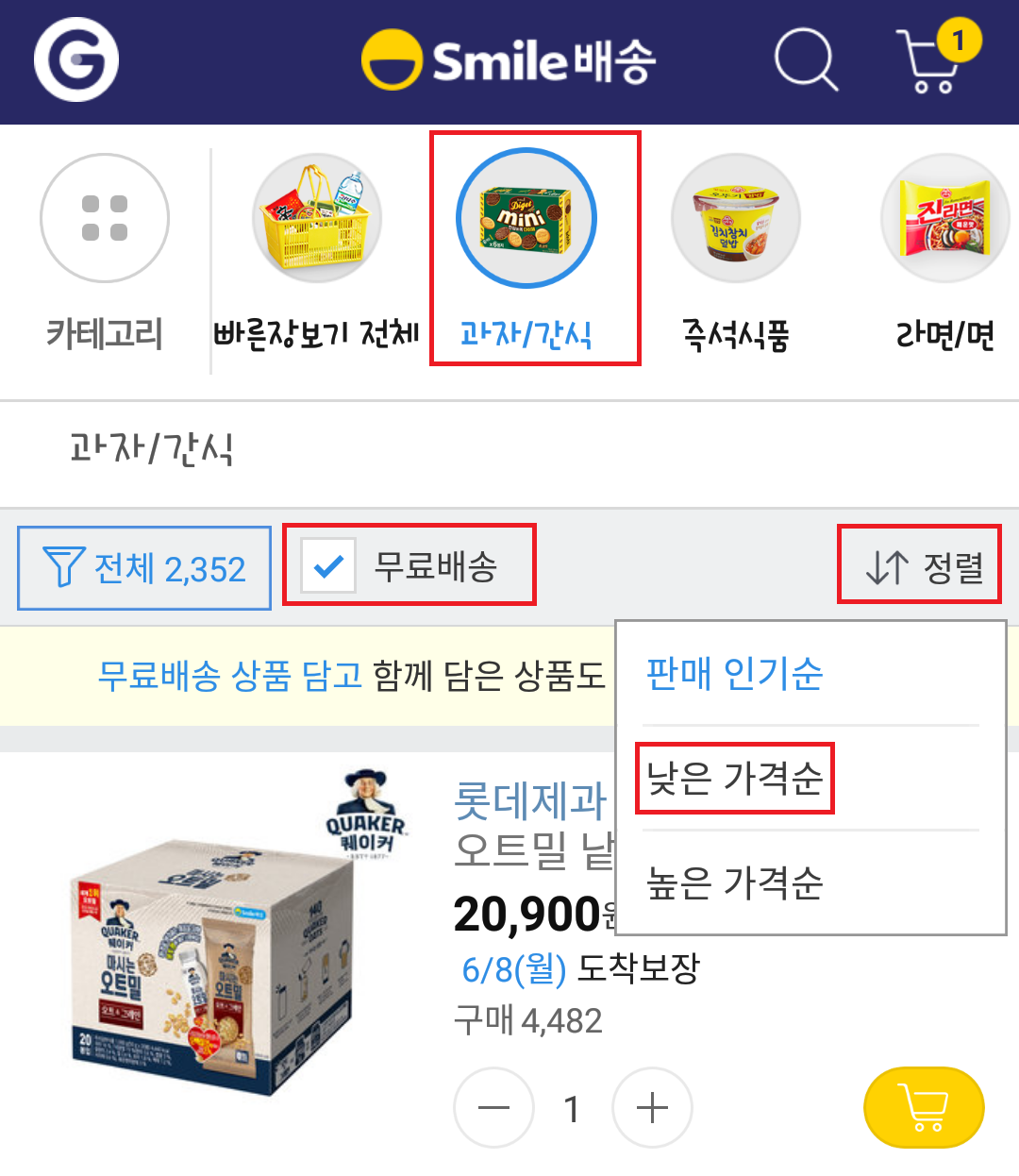 카테고리 중 '과자/간식'을 선택, 무료배송에 체크를 하고, 낮은 가격순으로 정렬을 합니다.