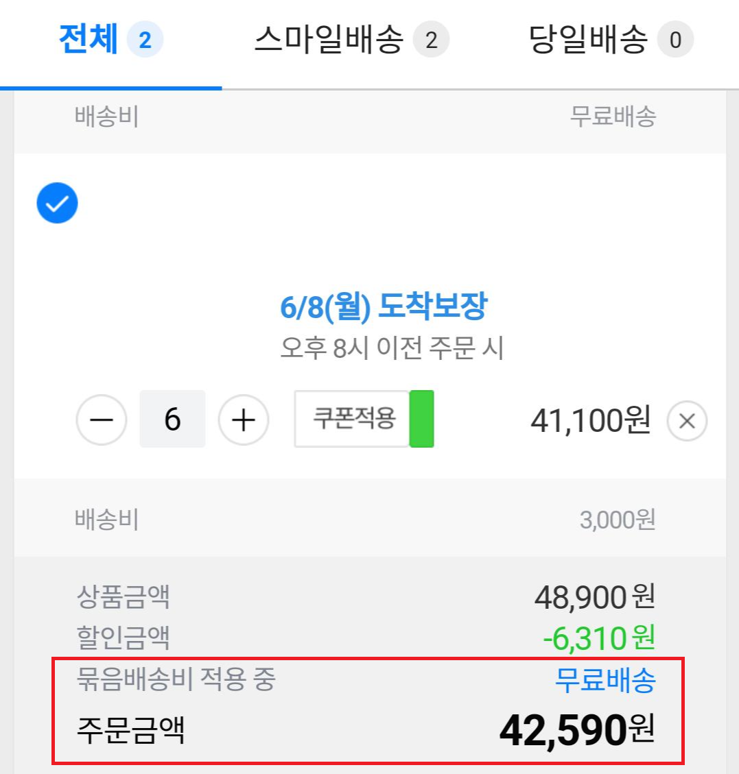 그럼 첫 번째로 주문한 44,100원짜리 상품의 최종 결제 금액에서 배송비 3,000원이 제외되어 41,100원이 되고, 여기에 과자 값 1,490원을 합산하면 두 상품의 최종 결제 금액은 42,590원이 됩니다.^^