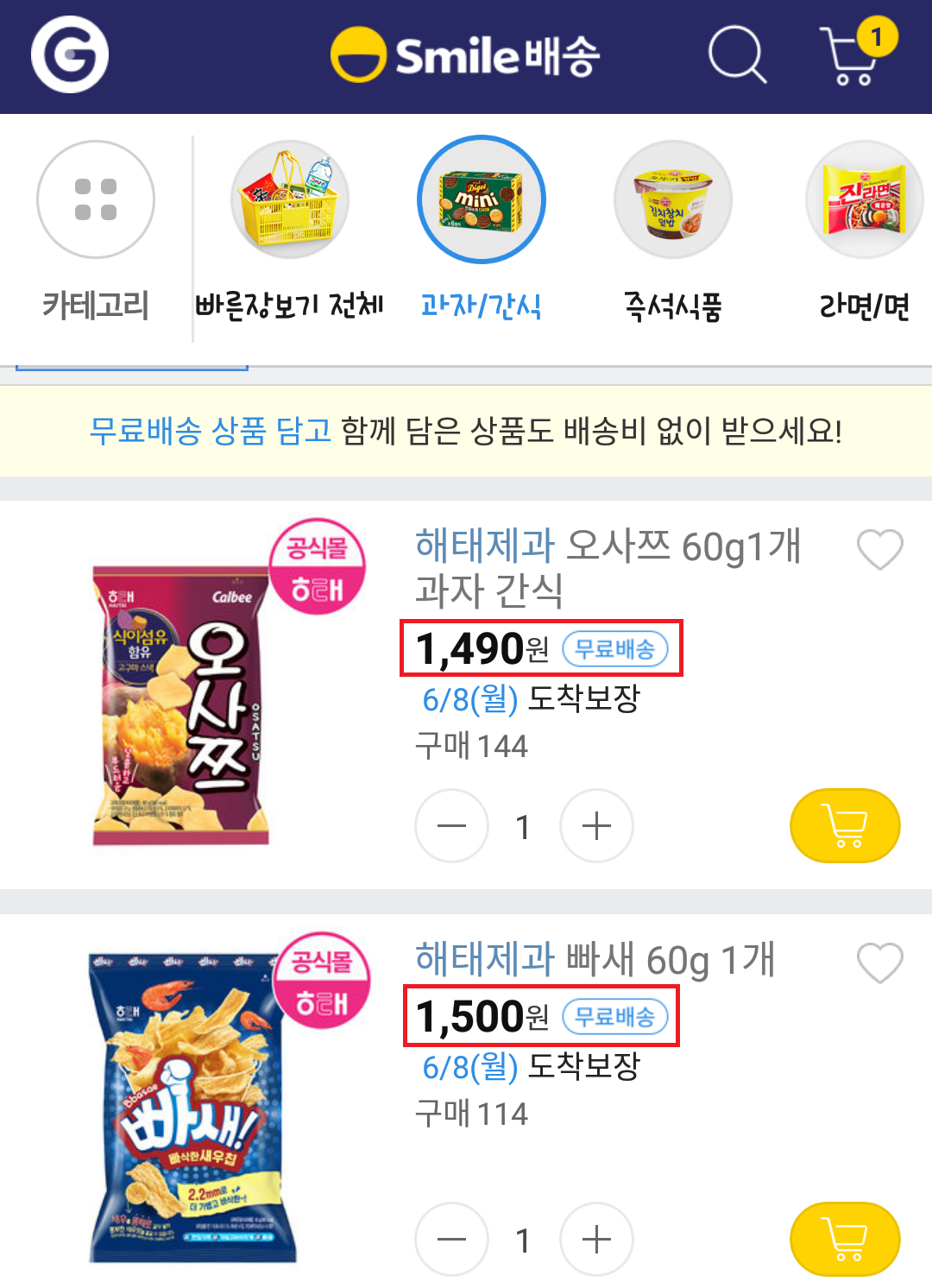 그럼 무료배송 가능한 과자들이 뜨는데 이중 가장 최저가인 과자를 하나만 장바구니에 담습니다.