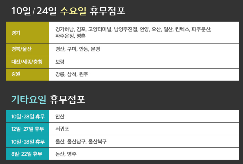 ■ 10일(수)/28일(일) 휴무_안산, 울산, 울산남구, 울산북구