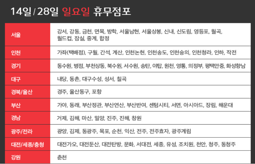 둘째, 넷째 주 일요일인 14일과 28일 일요일에 휴무인 점포는 위와 같습니다.