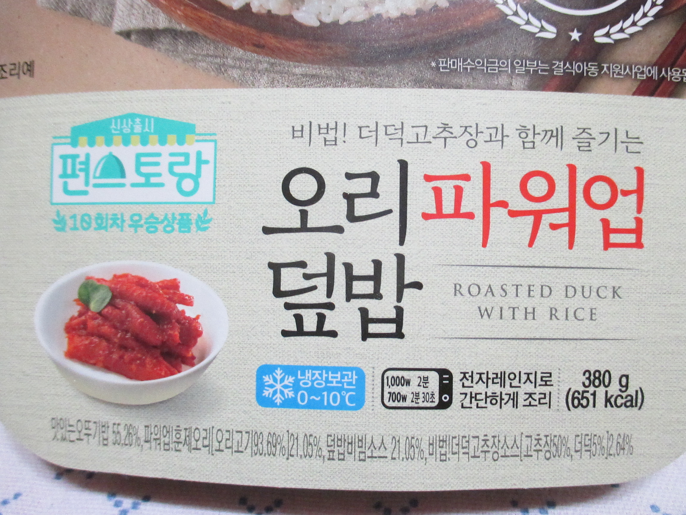 음... 설명서에서 담백하게 먹으려면 훈제오리의 포장지를 일부만 뜯어 별도로 데워 밥에 얹어먹으라고 되어있던데(1,000W 1분 / 700W 1분 20초_기름이 튀거나 흘러나올 수 있으므로 주의), 그렇게 먹었으면 좀 나았으려나요??