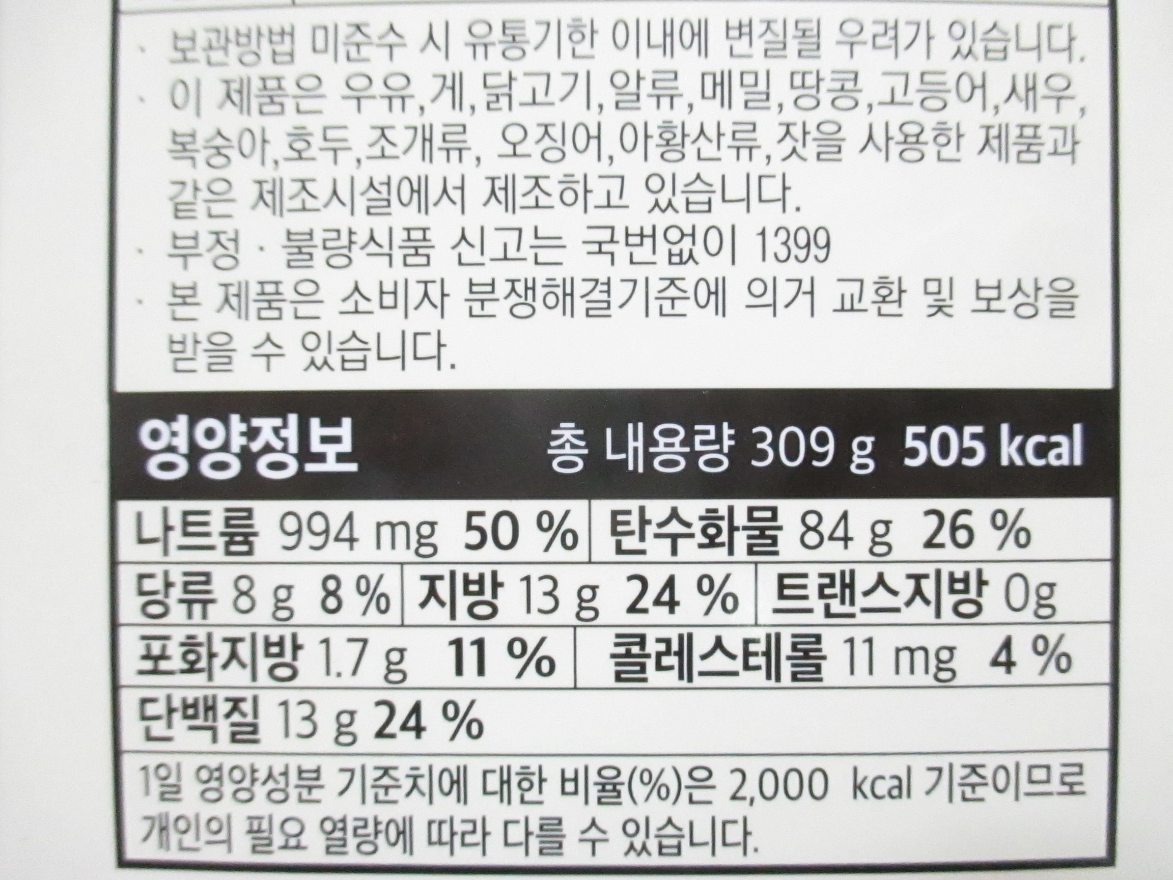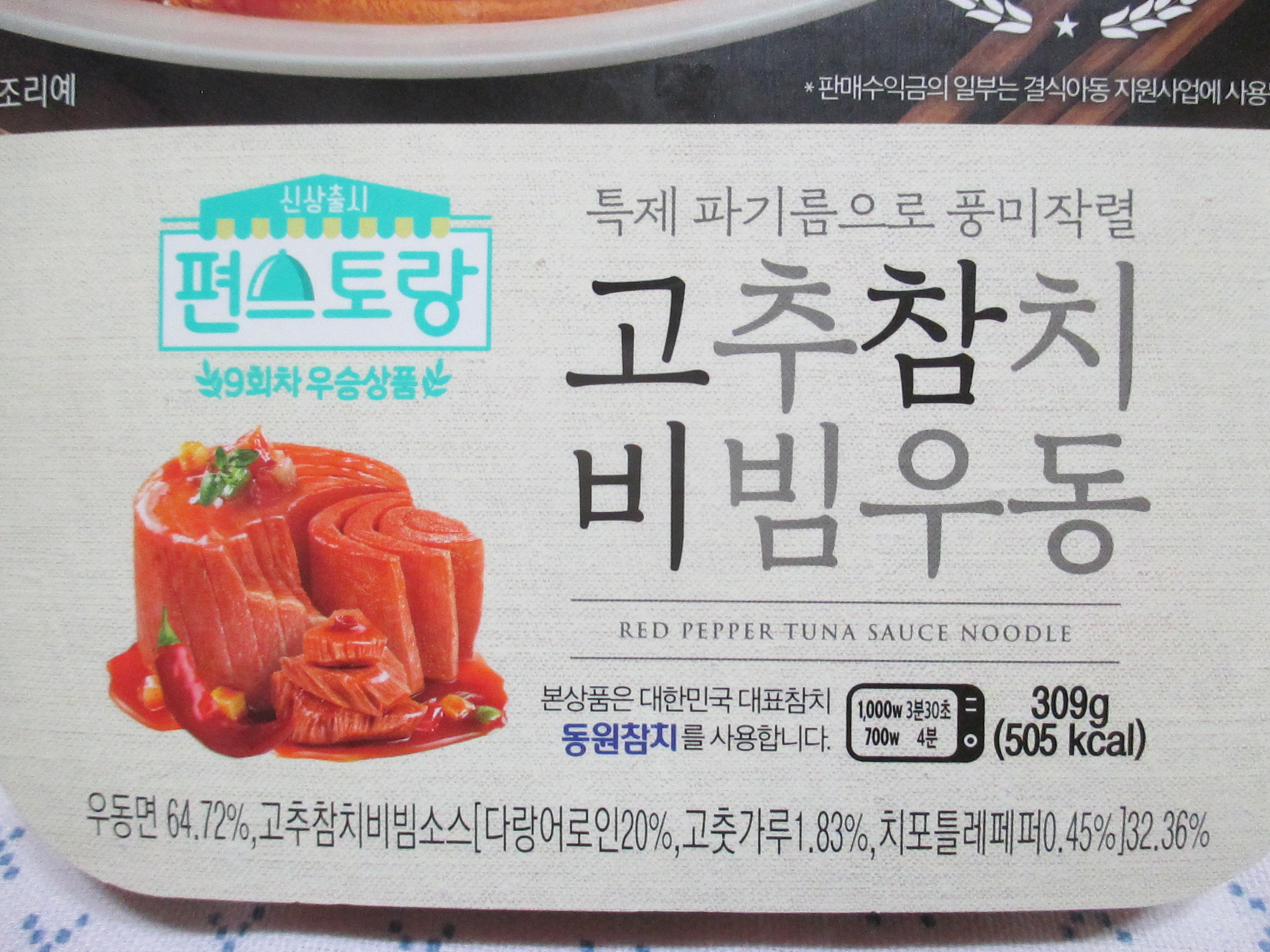 총 중량과 열량은 309g(우동면 200g+고추참치 비빔소스 100g+특제 파기름 9g+김깨가루 1g)에 505kcal이고, 함유량으로 따지면 우동면 64.72%, 고추참치비빔소스[다랑어로인 20%, 고춧가루 1.83%, 치포틀레페퍼 0.45%] 32.36%입니다. 참고로 본 상품에 사용된 고추참치는 동원참치입니다.