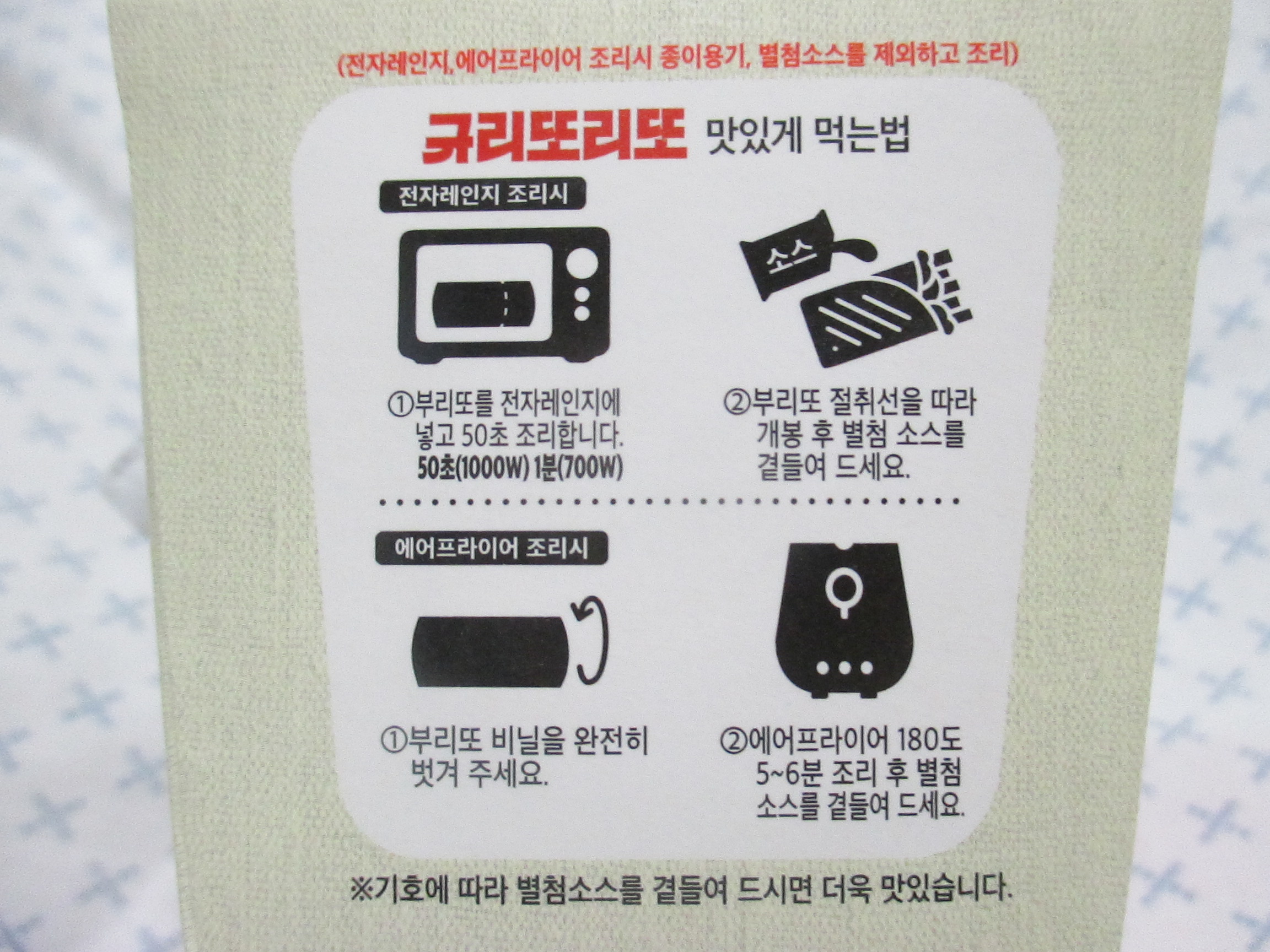 상자에서 부리또를 꺼내어 부리또만 전자레인지에 넣고 1000W는 50초, 700W는 1분 돌린 후, 포장지의 절취선을 따라 개봉 후 첨부된 홀갈릭 디핑소스를 곁들여 드시면 됩니다.