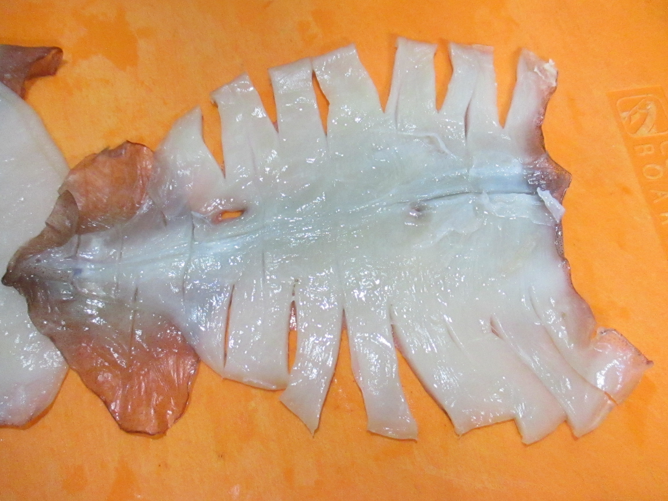 3. 가로, 세로로 칼집을 살짝 내어주긴 했지만 가장 자리는 다시 위와 같이 1~2cm 간격으로 완전히 잘라주세요. 그래야 오징어를 구울 때 말리는 것을 방지할 수 있고, 나중에 다 구웠을 때 찢어 먹기에도 편리해요. 그리고 가장자리를 자를 땐 안쪽으로 잘라야 잘 잘려요. 껍질이 붙어 있는 쪽으로 자르면 질겨서 칼의 상태에 따라 자르기 힘들 수도 있으니 꼭 안쪽으로 잘라주세요.
