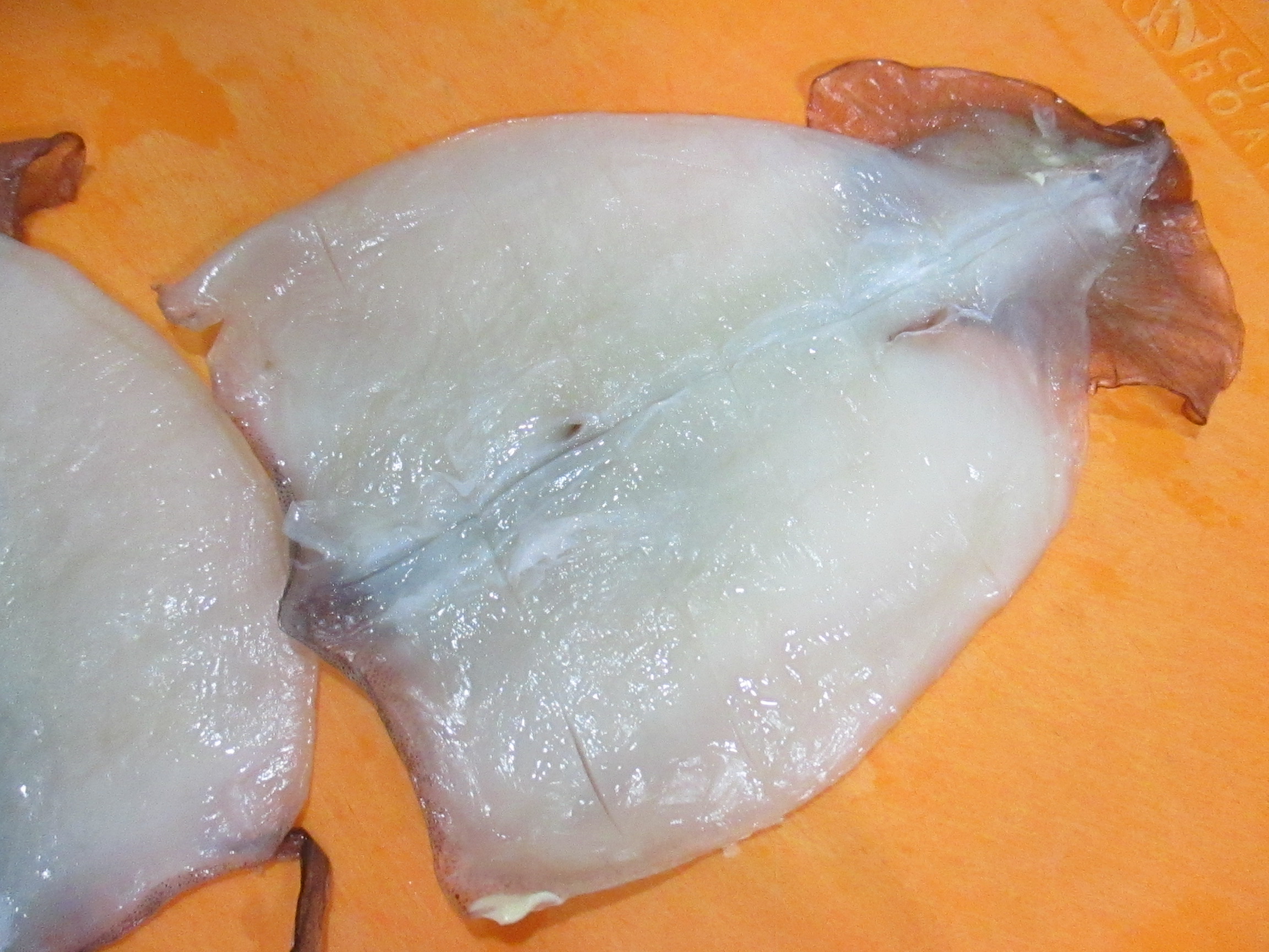 2. 오징어는 껍질을 벗겨내고 세로와 가로로 칼집을 내줍니다.