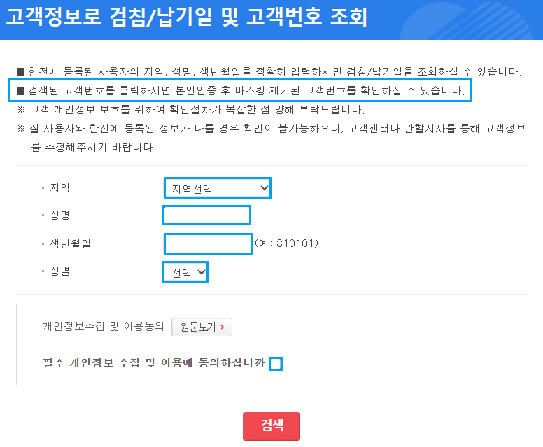 저는 고객번호를 알고 있어 바로 조회를 했었는데요, 홈페이지 오류인지 입력한 고객번호가 맞냐는 메시지 창만 뜨고 다음 단계로 넘어가지 않더라구요.ㅜㅜ