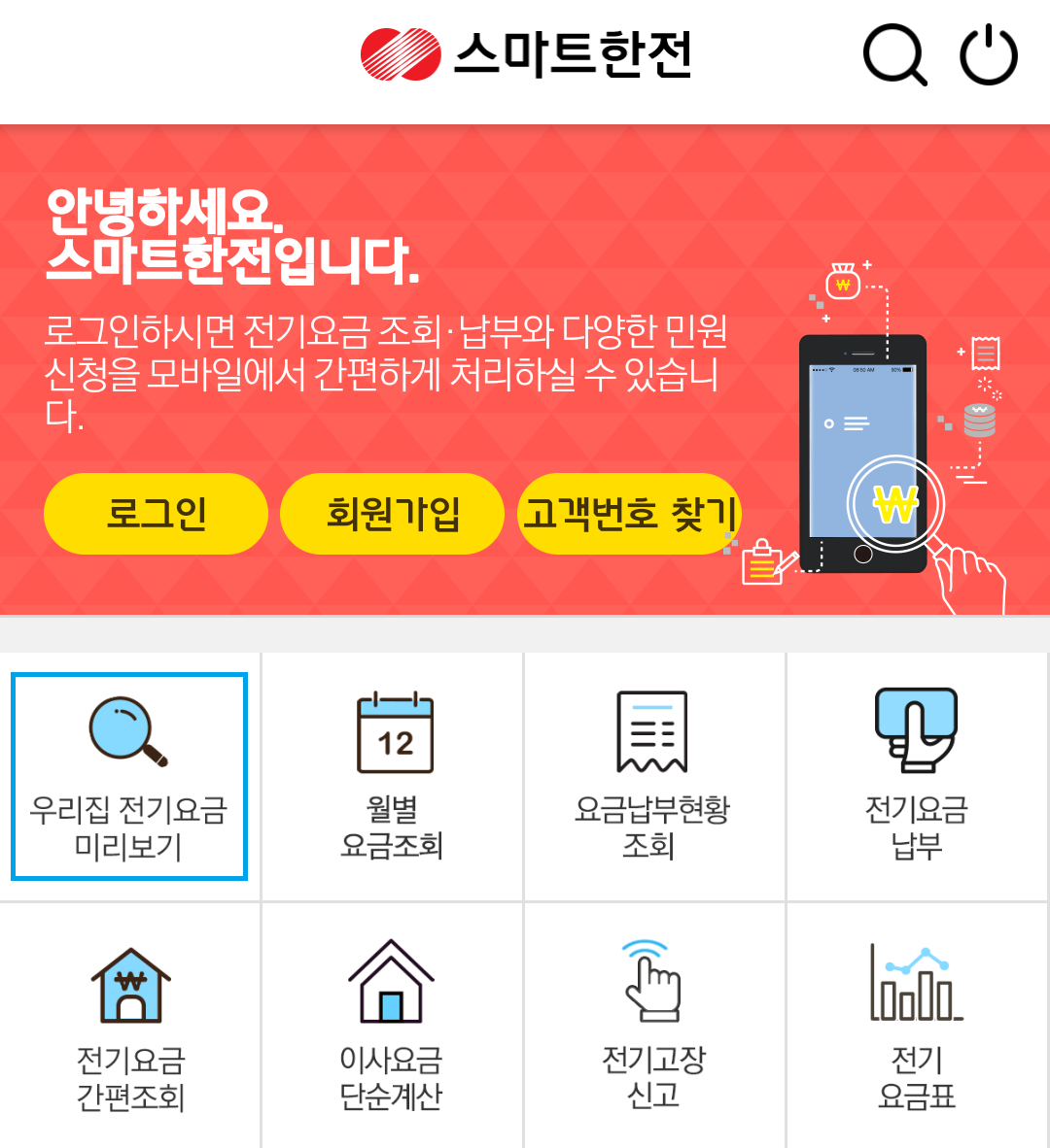 다음은 '스마트 한전' 앱에서 전기요금 조회하는 방법을 알려드릴게요.