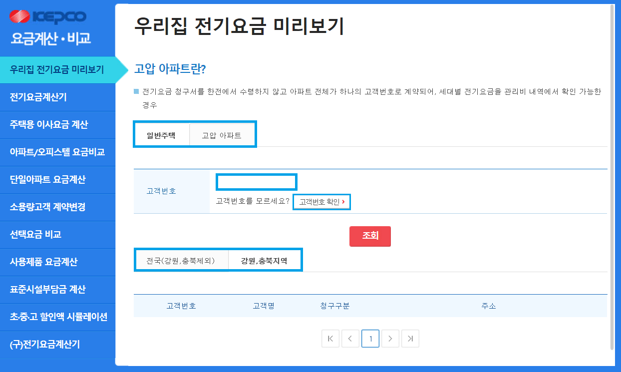 '일반주택'과 '고압 아파트', '전국(강원, 충북제외)'과 '강원 충북지역' 중 해당하는 주거 형태와 지역을 선택 후 '고객번호'를 입력합니다.