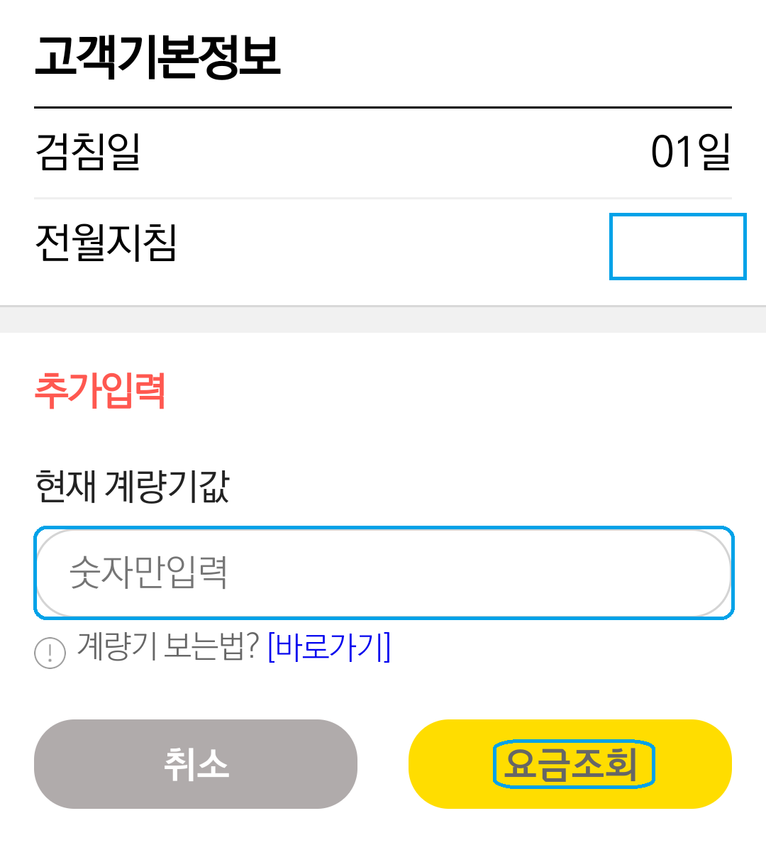 만약 고객번호 입력 후 다음 화면으로 넘어갔다면 전기 계량기를 확인하셔서 현재 계량기값을 입력하시면 현재까지 사용한 이달의 예상 전기요금을 확인할 수 있으실 거예요.
