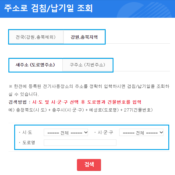저는 처음엔 주소 조회를 클릭했었는데, 정보가 없다고 나오더라구요. 아마 결과가 나왔더라도 주소는 '검침/납기일'조회만 가능한 게 아닌가 싶어요.
