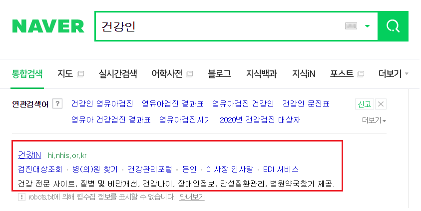 인터넷 검색창에서 '건강인'을 입력하면 '건강IN' 홈페이지 바로가기가 뜹니다.