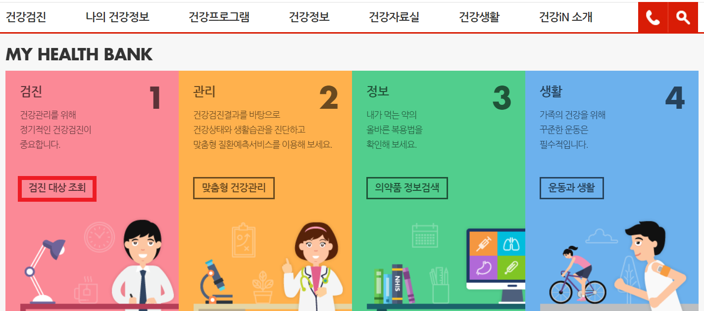 만약 위 기준을 보고도 자신이 검진 대상이 맞는지 잘 모르겠다거나 구체적으로 어떤 검진을 받게 되는지 궁금하다면 '건강검진 대상자 조회'를 통해 알아볼 수 있습니다. 방법은 아래와 같습니다.