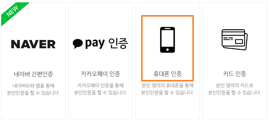 '네이버 간편인증, 카카오페이 인증, 휴대폰 인증, 카드 인증' 이상 4개의 인증 방법 중 하나로 본인임을 인증합니다.