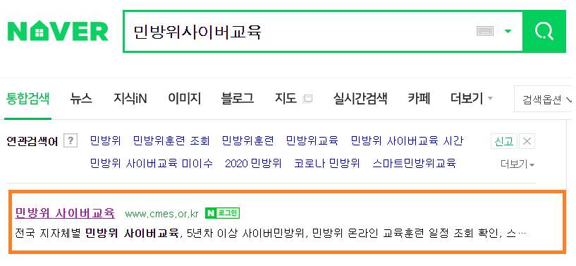 네이버나 다음 검색창에서 '민방위사이버교육'을 입력한 뒤 '민방위 사이버교육' 사이트로 들어갑니다.