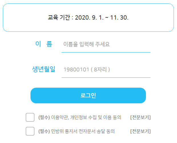 그러나 올해는 코로나19 확산의 영향으로 년차에 상관 없이 모두 사이버교육 1시간으로 대체하기로 하였습니다. 만약 올해 말까지 교육을 이수하지 않을 시 과태료 10만원이 부과되므로 잊지말고 기간 내에 이수하시기 바랍니다.