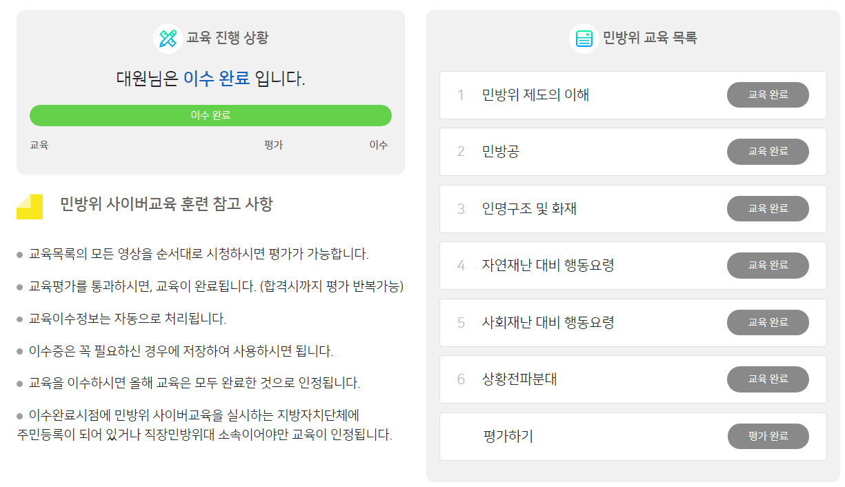 평가까지 마치고 나면 교육 진행 상황 바가 초록색으로 채워지고, 민방위 교육 목록의 상태는 '교육 완료'로 바뀌게 됩니다.