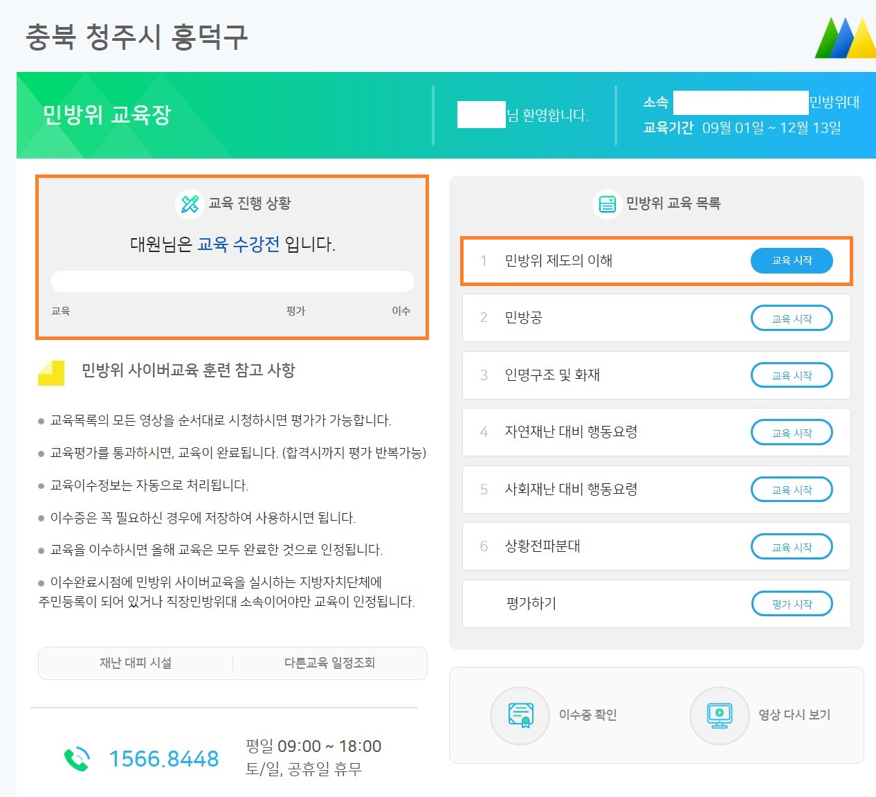 * 민방위 사이버 교육 고객센터 : 1566-8448(평일 9~18시, 토/일 공휴일 휴무)