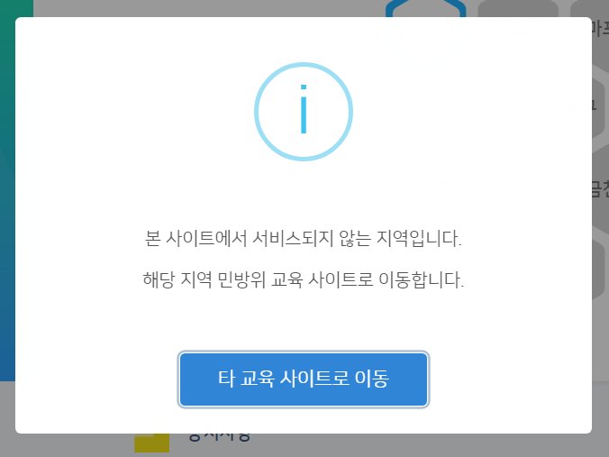 만약 좌측 이미지와 같이 타 교육 사이트로 이동하라는 메시지가 뜨면, 해당 사이트로 이동하셔서 다시 처음부터 로그인 절차를 따르시고, 우측과 같이 로그인 화면이 뜨면 이름, 생년월일, 동의 항목에 체크 후 '로그인' 버튼을 클릭합니다.