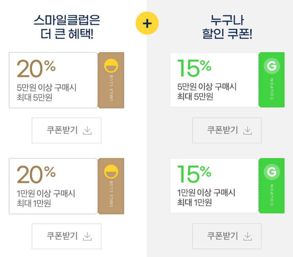 지마켓에서는 '한가위 빅세일'라고 해서 9월 14일부터 9월 27일까지 2주동안 최대 5만원 할인이 가능한 쿠폰을 매일 발급해 주고 있어요. 구입하시는 상품 금액에 따라 5만원/1만원/5천원 할인을 받으실 수 있는데, 기존 스마일 클럽 회원이시면 일반 회원보다 5% 더 할인 받으실 수 있으세요.