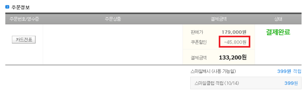 위 이미지는 제가 오늘 구입한 상품의 주문 정보인데, 한가위 빅세일 쿠폰을 적용했더니 인터넷 전체 최저가보다 저렴했어요.