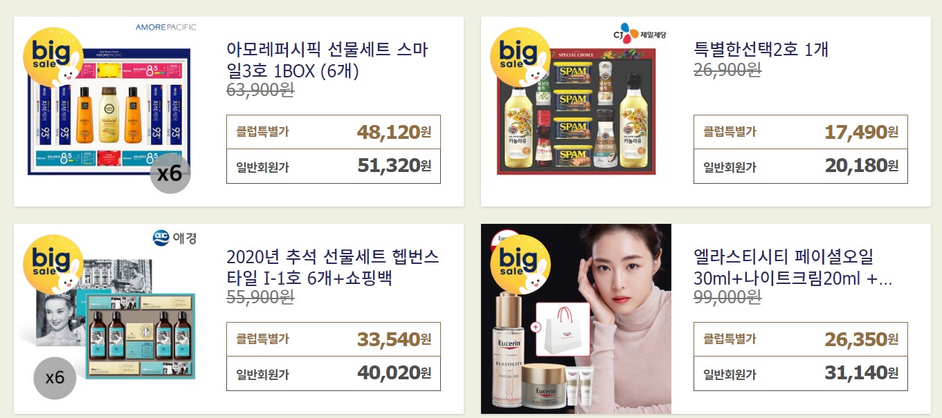 세일 대상 상품은 위 이미지에서처럼 노란색의 'big sale' 딱지가 붙어 있어 한 눈에 알아볼 수 있으세요. 참고로 추석선물세트로 한우, 생활용품, 화장품 등을 많이 하실 텐데, 올해는 코로나 때문에 면역력에 좋은 건강식품이 특히 인기라네요.