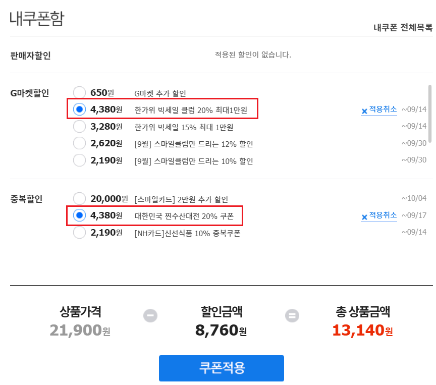 위는 구입 예정인 또 다른 상품으로 수산물인데, 쿠폰을 2개 적용시켰더니 8,760원 할인이 되네요.