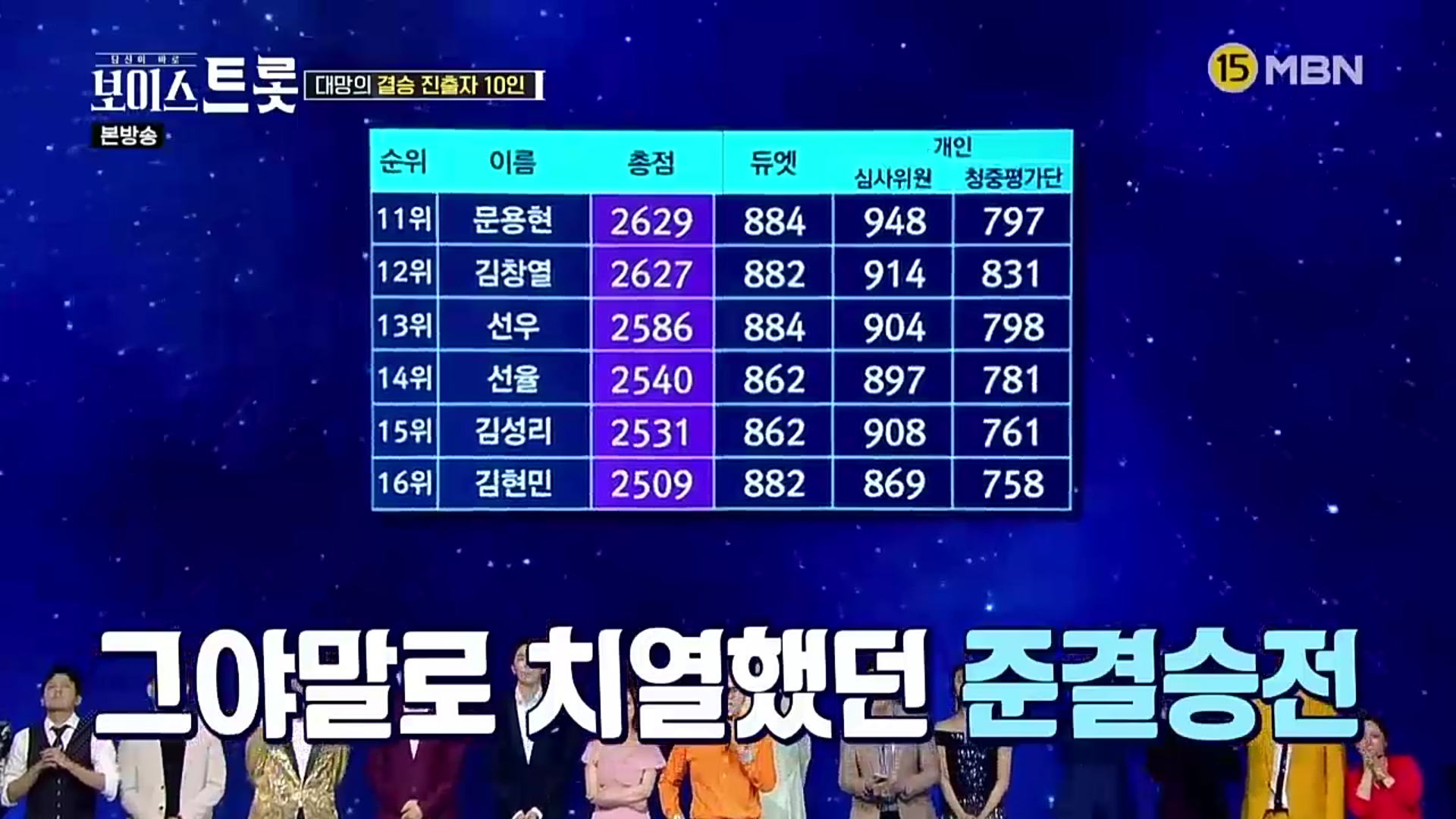 탈락자 분들의 점수와 순위도 공개가 되었는데요, 11위부터 16위는 문용현(2629점), 김창열(2627점), 선우(2586점), 선율(2540점), 김성리(2531점), 김현민 씨(2506점) 순입니다.