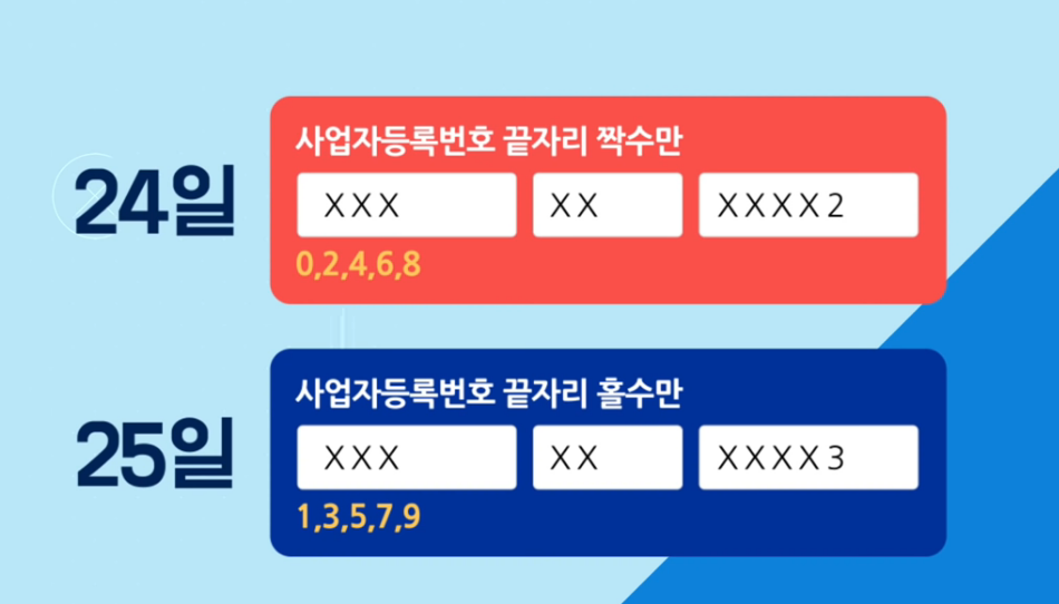 사업자등록번호 끝자리가 짝수이면 24일(목), 홀수면 25일(금)에 신청 가능하며, 26일부터는 홀짝수와 상관 없이 신청할 수 있습니다.