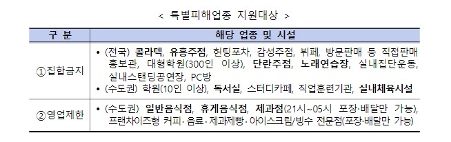 * 자치단체의 자체 집합금지명령 업종은 특별피해업종으로 인정되지 않음.