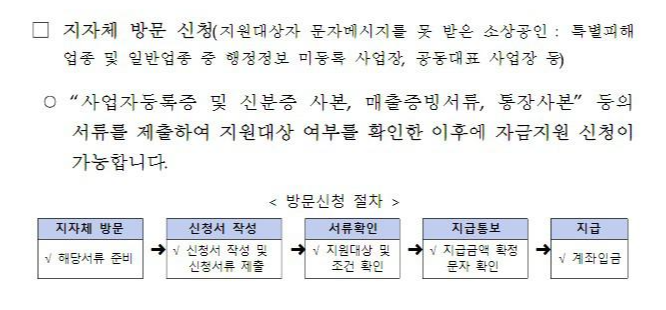 * 지자체 방문 신청 대상자 : 지원대상자 문자메시지를 못 받은 소상공인(특별피해업종 및 일반업종 중 행정정보 미등록 사업장, 공동대표 사업장 등)_사업자등록증 및 신분증 사본, 매출증빙서류, 통장사본 등의 서류를 제출 → 지원대상 여부 확인 후 지급.