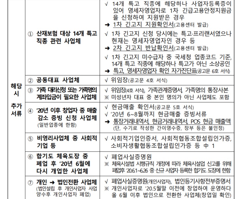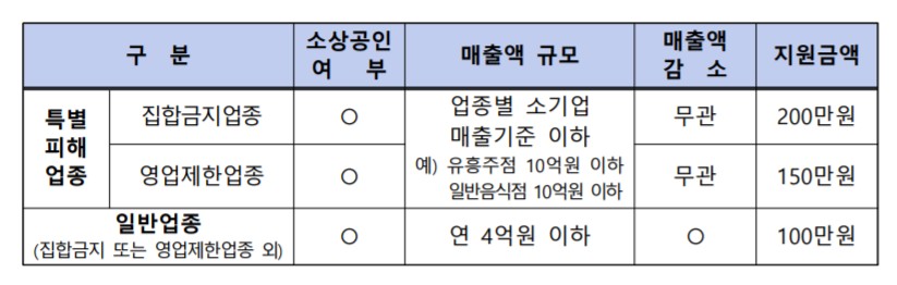 일반업종과 특별피해업종 모두 2020년 5월 31일 이전에 창업하여 신청일 기준, 실제 영업중인 소상공인으로 집합금지업종은 200만원, 영업제한업종은 150만원, 일반업종은 100만원을 받으실 수 있습니다.