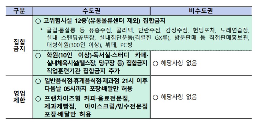 * 다중이용시설 중 집합금지업종 및 영업제한업종 기준은 위 표를 참고해주세요.