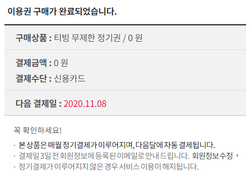 저는 결제수단을 신용카드로 선택하여 결제 금액이 0원이었으며, 10월 9일 쿠폰을 등록하였기에 다음 결제일은 11월 8일이 됩니다. 결제일 3일전에 회원정보에 등록된 이메일로 알려준다니 참고하세요.
