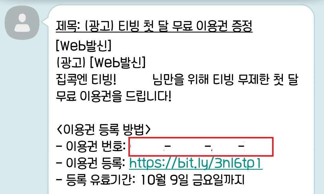 티빙에서는 회원 가입을 하고 무료 서비스만 이용중일 경우 위처럼 무제한 한 달 무료 이용권을 문자 메시지로 보내줍니다. 회원 가입 시 바로 보내주는 건 아니고 이용 도중에 오는데, 등록 유효기간이 있어서 기간이 지나면 이용할 수 없습니다. 하지만 등록하지 않을 시 또 오더라구요. ^^
