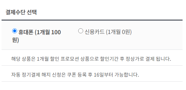 이때 신용카드 결제를 선택하면 결제 금액이 0원이지만, 휴대폰 결제의 경우는 100원이 결제됩니다. 100원이면 큰 돈이 아니므로 한 달만 이용할 건데 신용카드 정보를 등록하는 것이 내키지 않으신 분들은 휴대폰을 선택하시면 되겠습니다.