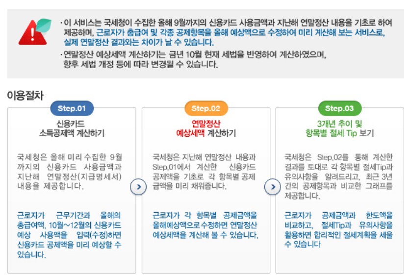 연말정산 미리보기는 '신용카드 소득공제액 계산하기 - 연말정산 예상세액 계산하기 - 3개년 추이 및 항목별 절세 Tip 보기' 이렇게 3단계 절차를 따릅니다.
