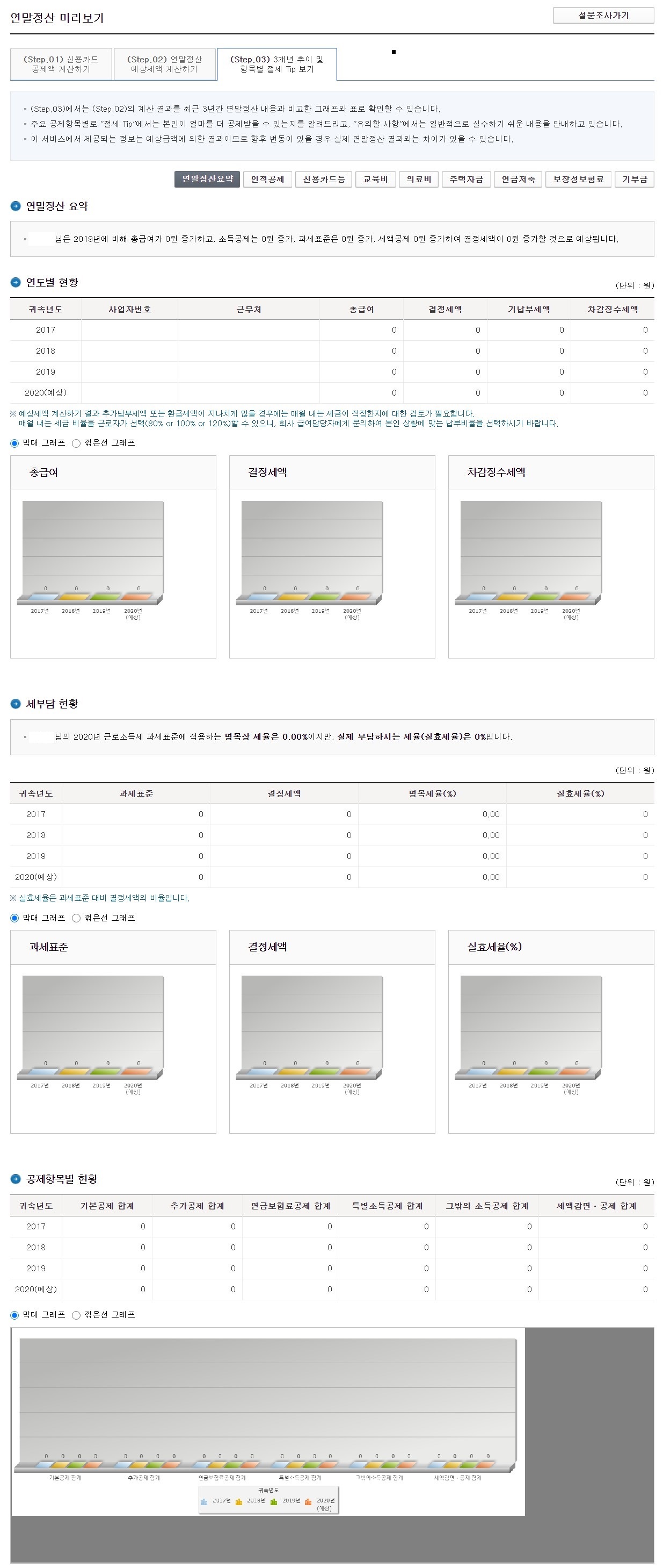 3단계인 '3개년 추이 및 항목별 절세 Tip 보기'에서는 2단계에서 알아본 계산 결과를 최근 3년간 연말정산 내용과 비교한 그래프와 표로 확인해 볼 수 있습니다. 또한 주요 공제 항목별로 얼마나 더 공제받을 수 있는지(절세 팁)와 일반적으로 실수하기 쉬운 사항 등(유의사항)을 알려줍니다.