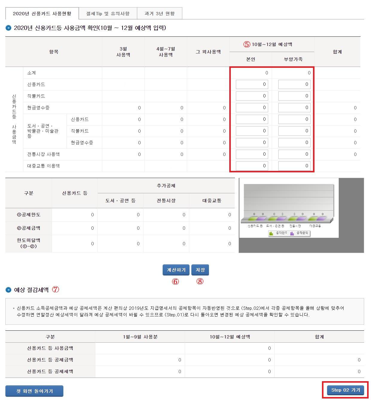 신용카드 사용금액은 9월까지 사용한 금액만 정보가 제공되며, 10월~12월분은 사용금액을 예상하여 본인이 직접 입력해야 합니다. '10월~12월 예상액'을 입력 후 '계산하기'를 누르면 '예상 절감세액'을 확인할 수 있으며, 확인 후 '저장'을 누른 다음 'Step 02 가기(2단계)'를 클릭하여 2단계로 넘어갑니다.