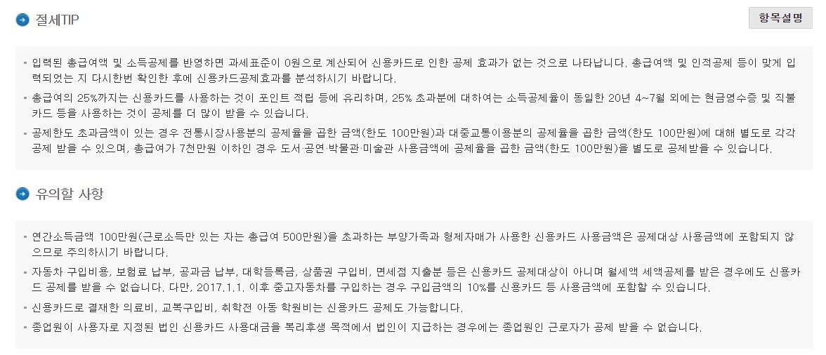 * 인적공제, 신용카드등, 교육비 등 개별 항목을 클릭하시면 해당 절세 팁과 유의사항을 확인할 수 있습니다.