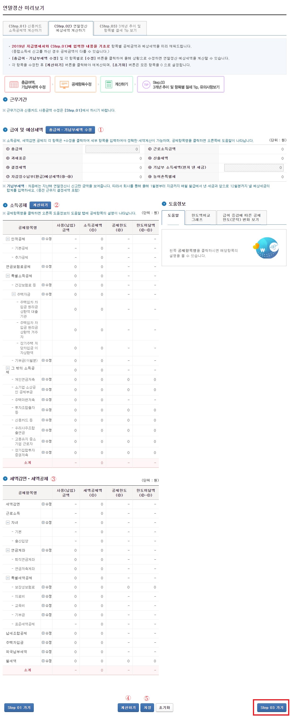 수정 및 확인을 마쳤으면 '계산하기' - '저장'을 누른 다음 'Step 03 가기(3단계)'로 넘어갑니다.