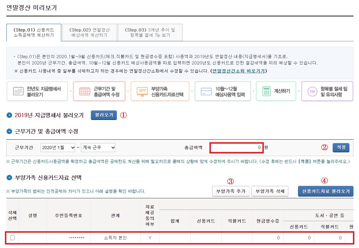 첫 단계인 '신용카드 소득공제액 계산하기'에서는 '2019년 지급명세서 불러오기' - '근무기간 및 총급여액 수정[적용]' - 부양가족 신용카드 자료 선택[부양가족 추가]' - '신용카드 자료불러오기' 순으로 따라 본인과 부양가족의 신용카드 사용금액을 불러옵니다.
