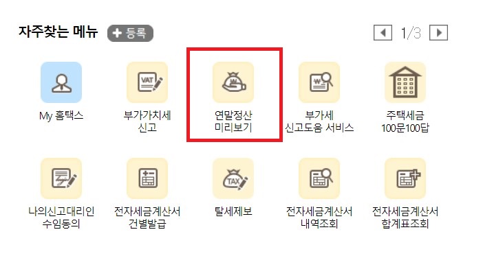 국세청 홈택스에 접속하신 뒤 첫 페이지에서 '자주찾는 메뉴' 중 '연말정산 미리보기'로 들어갑니다.