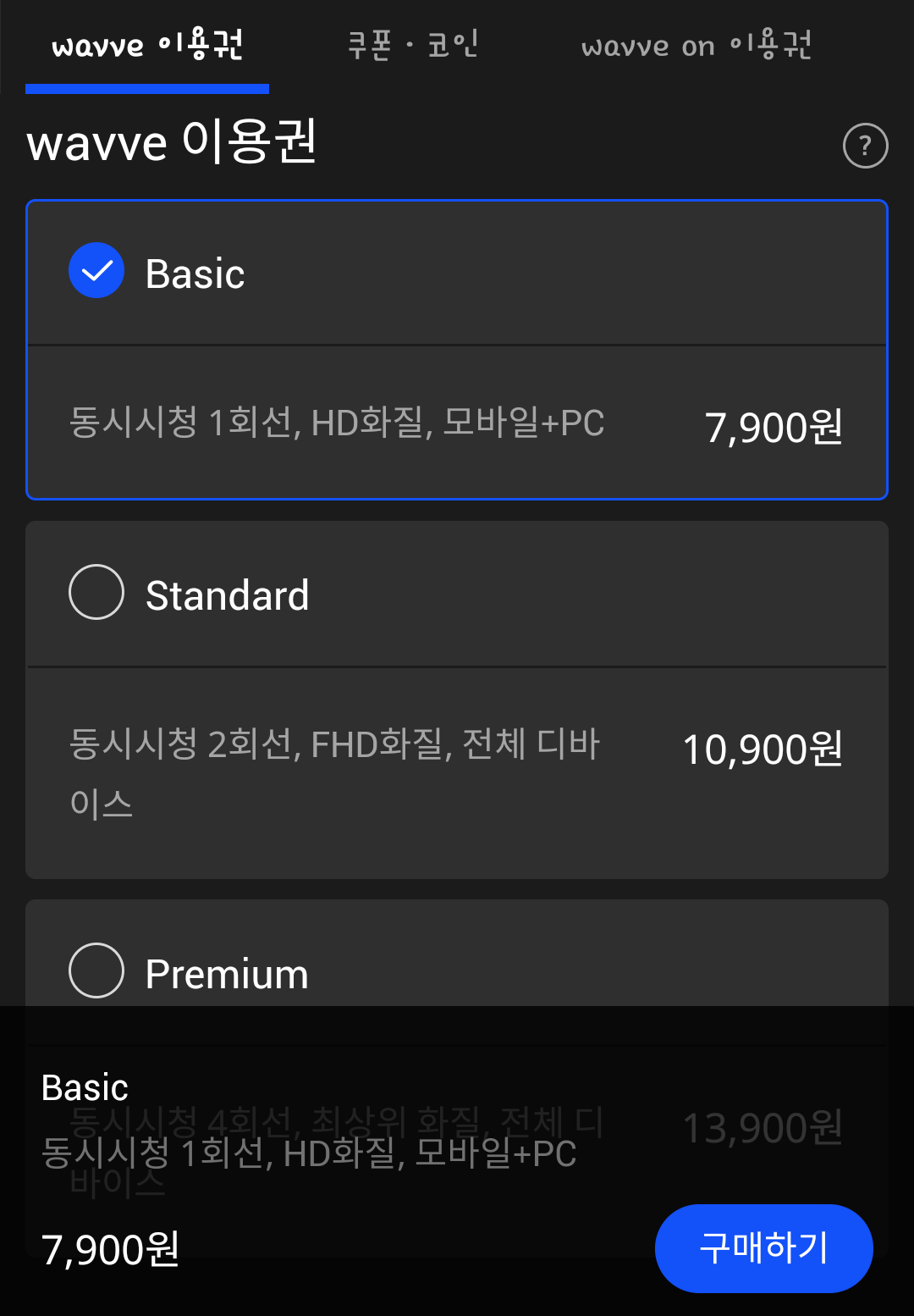 웨이브(wavve) 요금제는 베이직, 스탠다드, 프리미엄 세 가지로 요금은 각각 7,900원 / 10,900원 / 13,900원이에요. 요금의 차이는 동시 시청 회원수와 화질에 따른 차이입니다.