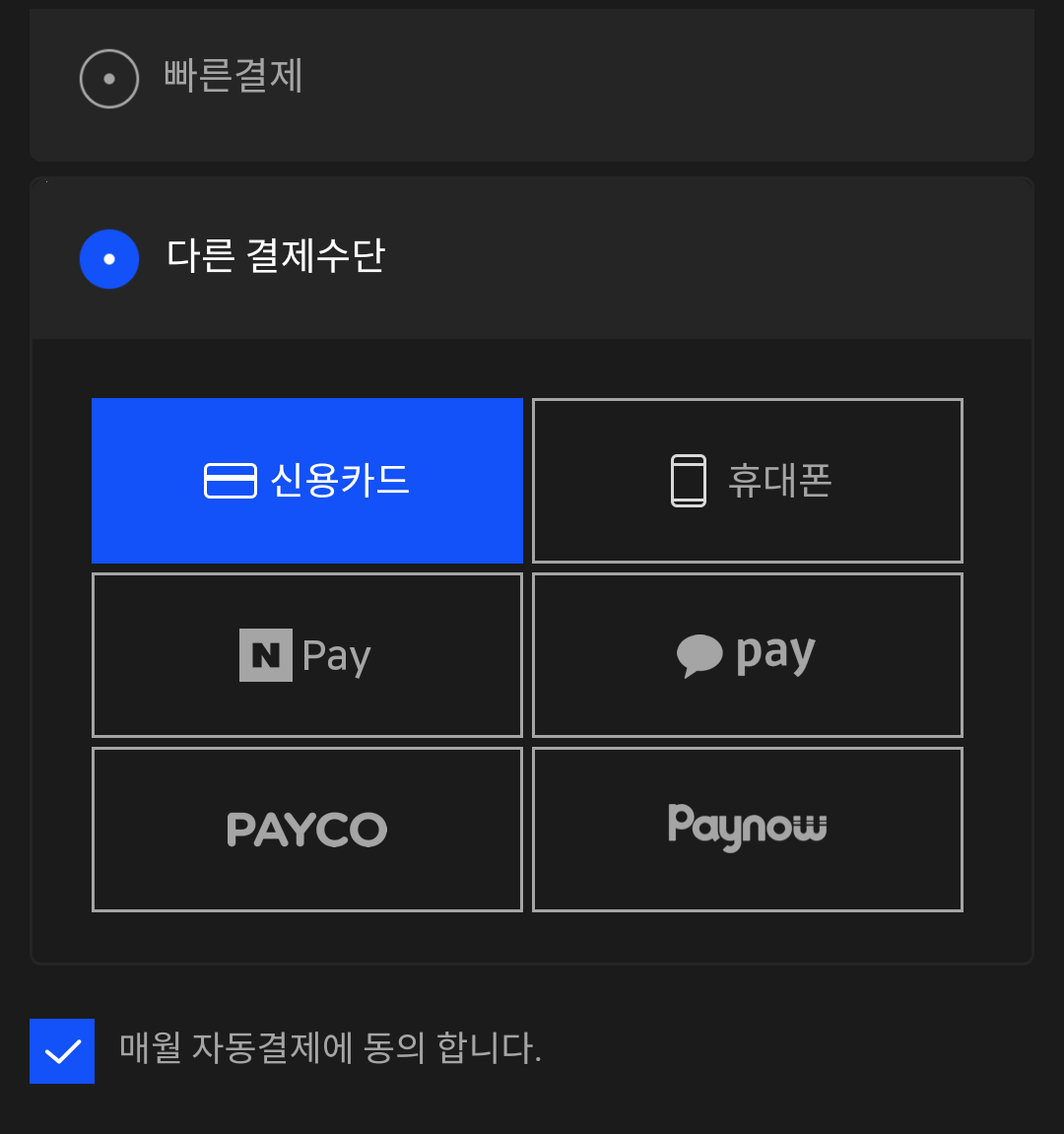 결제 방식은 "빠른 결제"와 "다른 결제수단"이 있는데요, 처음에는 빠른결제 수단으로 기본 설정이 되어있으므로 꼭 다른 결제수단으로 변경 후 결제해 주세요. 빠른 결제의 경우 카드를 등록하도록 유도하고 있거든요.